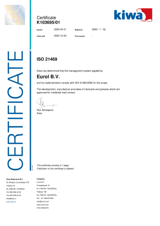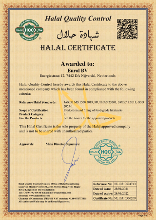 В октябре 2019 года наша компания прошла сертификацию по ISO 21469 -международный стандарт, определяющий требования к смазочным материалам, используемым при производстве продуктов питания и напитков. ISO 21469 — это международная норма, определяющая санитарно-гигиенические требования в отношении состава, условий производства и применения смазочных материалов категории H1, используемых в пищевой и фармацевтической промышленности, которые могут случайно войти в контакт с пищевыми продуктами в процессе их производства. Кроме того, Eurol получил сертификат Халяль. в декабре 2019 года, что показывает, что смазочные материалы Eurol Specialty могут также использоваться пищевыми компаниями, где продукты питания производятся под знаком качества Halal.