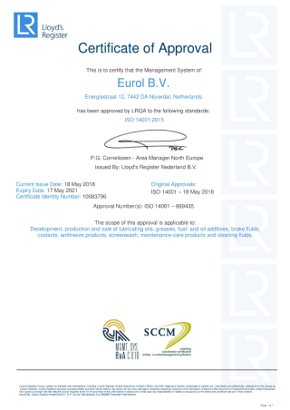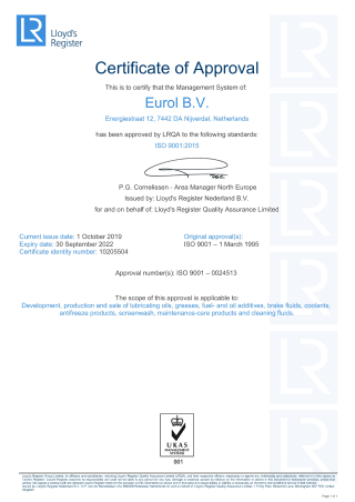 Аудиторы Lloyd’s Register Nederland B.V. продолжают периодически посещать компанию с целью проверки того, что система продолжает соблюдать требования стандартизации к выпускаемой продукции. И система остается современной и обеспечивает постоянное качество продукции, что является гарантией для клиентов Eurol Lubricants B.V.