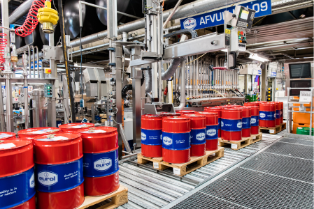 Специально разработанные технологические установки для производства смазочных материалов обеспечивают компании Eurol беспрецедентно высокий и стабильный класс качества. Для этого смешивающие установки оборудованы самокалибрующимися массовыми расходомерами, что обеспечивает высокую точность и надежность измерений. Установки смешивания сделаны полностью из нержавеющей стали с полированной и гладкой поверхностью, которая спо собствует более быстрым и легким изменениям изделия .